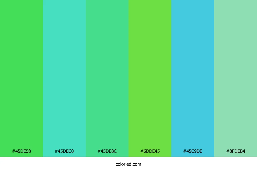 | #45DE8C | 69, 222, 140 | 148, 70%, 57% | 69%, 0%, 37%, 13% | oklch(0.801 0.173 155) | |