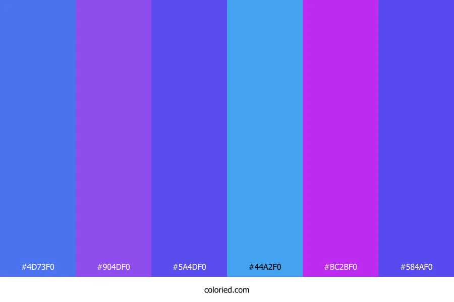 | #5A4DF0 | 90, 77, 240 | 245, 84%, 62% | 62%, 68%, 0%, 6% | oklch(0.538 0.234 279) | |