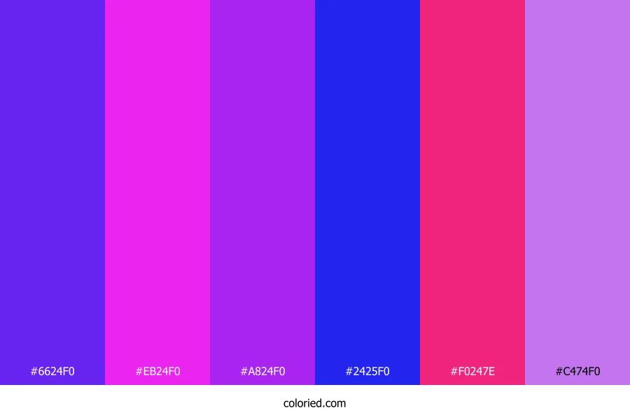 | #2425F0 | 36, 37, 240 | 240, 87%, 54% | 85%, 85%, 0%, 6% | oklch(0.460 0.280 268) | |