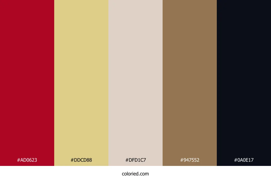 ![]() | #AD0623 | 173, 6, 35 | 350, 93%, 35% | 0%, 97%, 80%, 32% | oklch(0.474 0.188 23) |