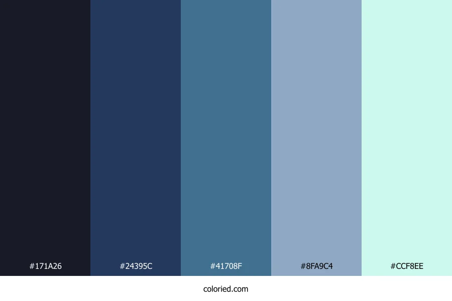 | #24395C | 36, 57, 92 | 218, 44%, 25% | 61%, 38%, 0%, 64% | oklch(0.345 0.067 260) | |