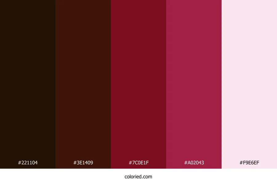 | #7C0E1F | 124, 14, 31 | 351, 80%, 27% | 0%, 89%, 75%, 51% | oklch(0.378 0.141 21) | |