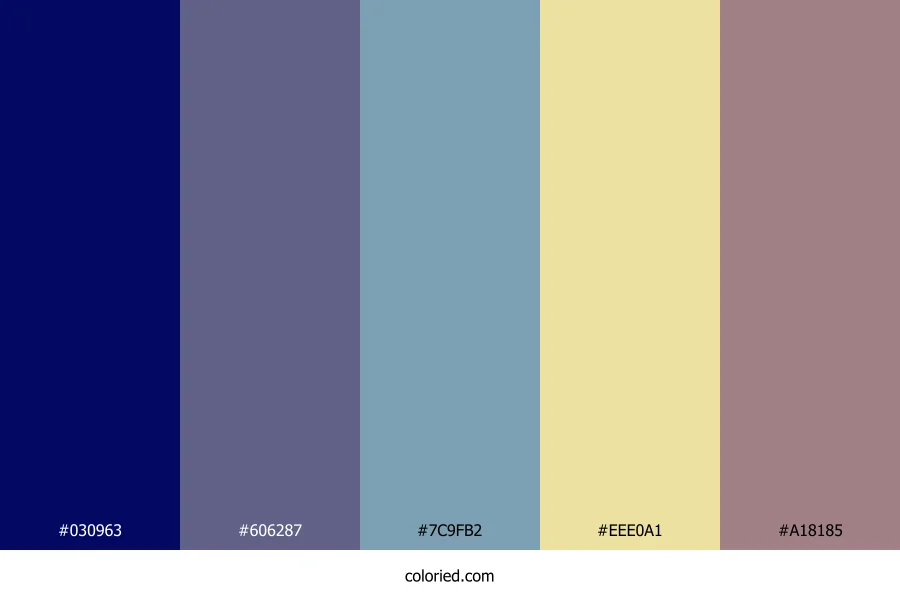 ![]() | #030963 | 3, 9, 99 | 236, 94%, 20% | 97%, 91%, 0%, 61% | oklch(0.238 0.148 266) |