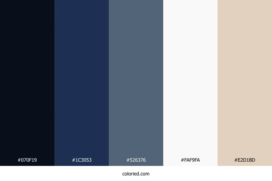 ![]() | #070F19 | 7, 15, 25 | 213, 56%, 6% | 72%, 40%, 0%, 90% | oklch(0.166 0.025 254) |