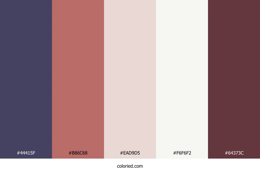 ![]() | #44415F | 68, 65, 95 | 246, 19%, 31% | 28%, 32%, 0%, 63% | oklch(0.391 0.050 288) |