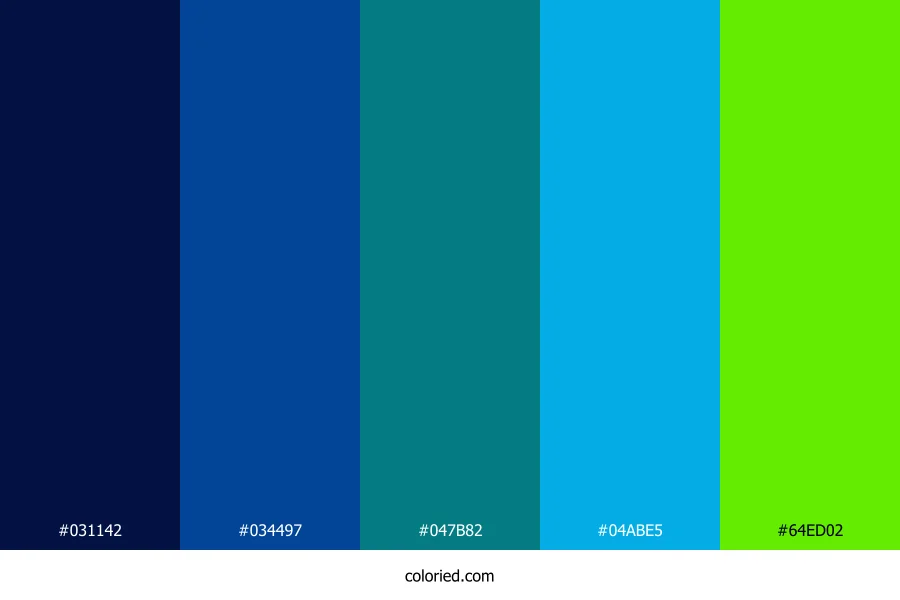 ![]() | #031142 | 3, 17, 66 | 227, 91%, 14% | 95%, 74%, 0%, 74% | oklch(0.207 0.095 265) |