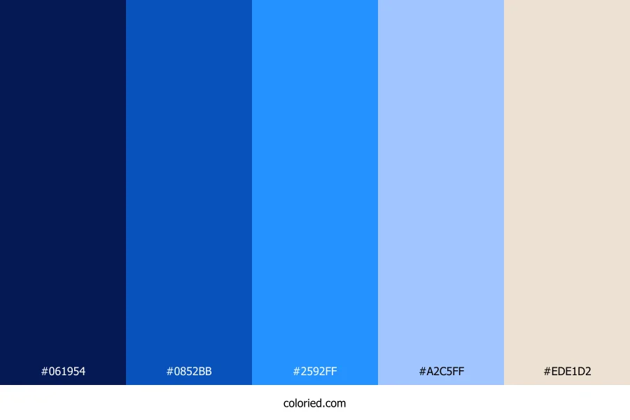 ![]() | #061954 | 6, 25, 84 | 225, 87%, 18% | 93%, 70%, 0%, 67% | oklch(0.247 0.110 265) |