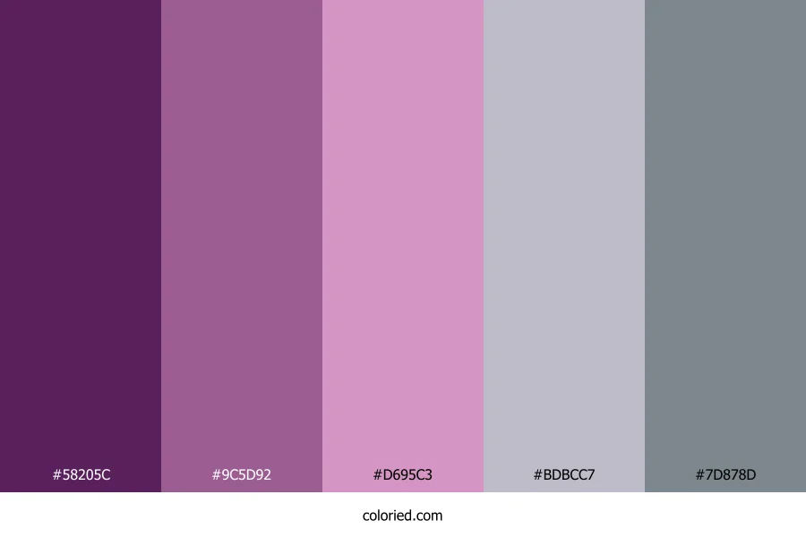 ![]() | #58205C | 88, 32, 92 | 296, 48%, 24% | 4%, 65%, 0%, 64% | oklch(0.353 0.116 325) |