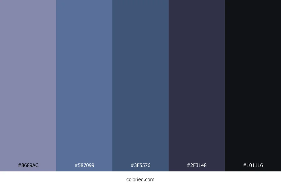 | #587099 | 88, 112, 153 | 218, 27%, 47% | 42%, 27%, 0%, 40% | oklch(0.543 0.071 261) | |