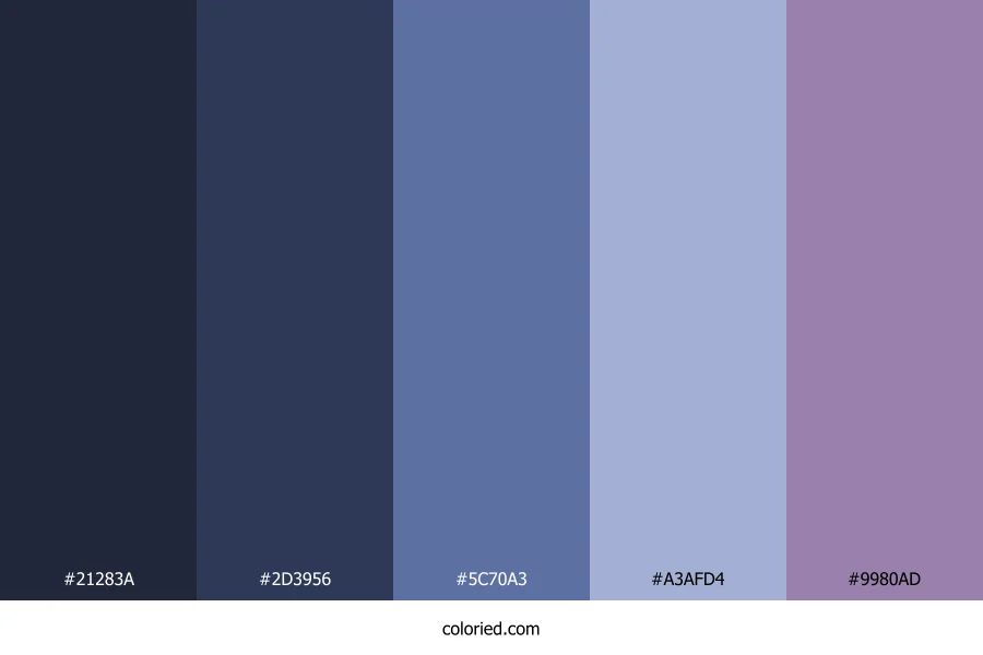 ![]() | #21283A | 33, 40, 58 | 223, 27%, 18% | 43%, 31%, 0%, 77% | oklch(0.279 0.035 268) |