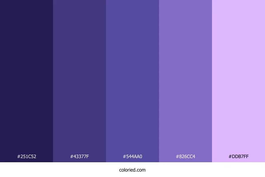 ![]() | #251C52 | 37, 28, 82 | 250, 49%, 22% | 55%, 66%, 0%, 68% | oklch(0.272 0.094 286) |