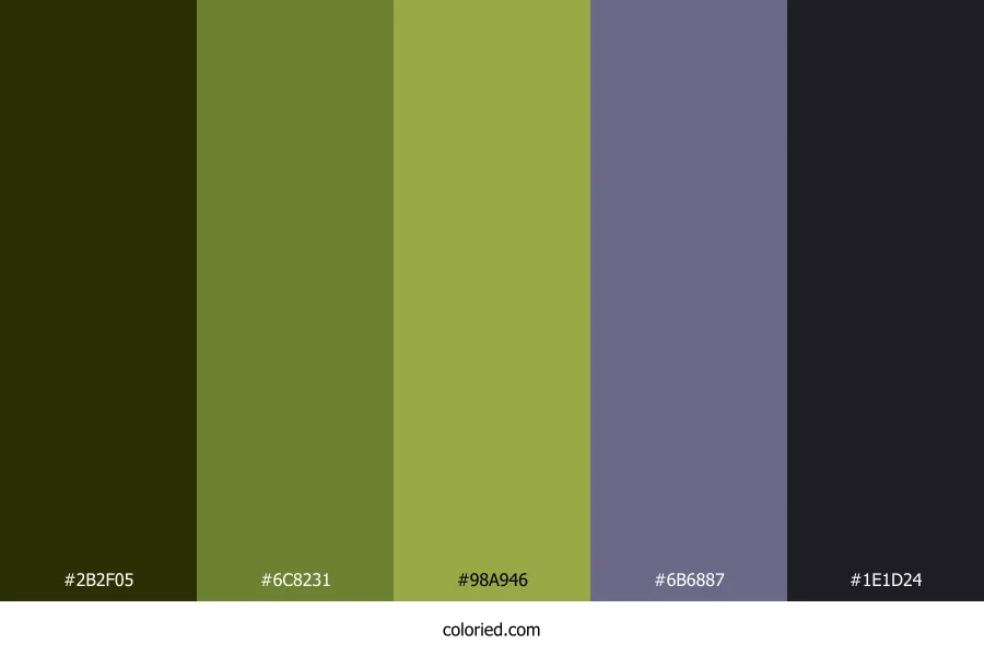 ![]() | #2B2F05 | 43, 47, 5 | 66, 81%, 10% | 9%, 0%, 89%, 82% | oklch(0.292 0.061 115) |