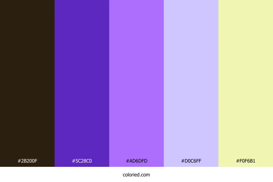 | #5C28C0 | 92, 40, 192 | 261, 66%, 45% | 52%, 79%, 0%, 25% | oklch(0.449 0.215 290) | |
