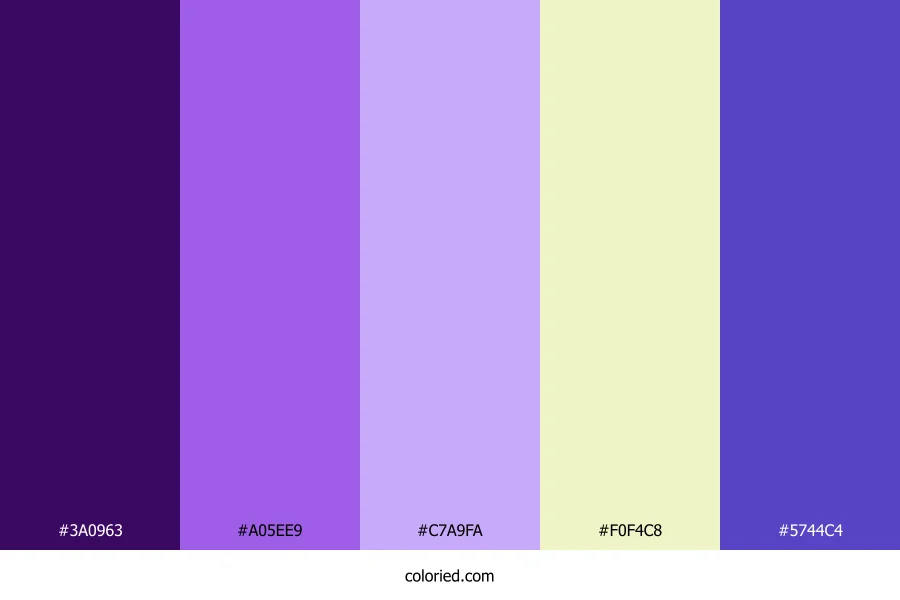 ![]() | #3A0963 | 58, 9, 99 | 273, 83%, 21% | 41%, 91%, 0%, 61% | oklch(0.290 0.140 302) |