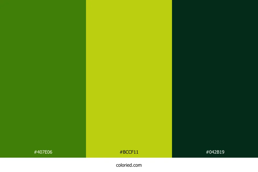 ![]() | #407E06 | 64, 126, 6 | 91, 91%, 26% | 49%, 0%, 95%, 51% | oklch(0.530 0.153 135) |