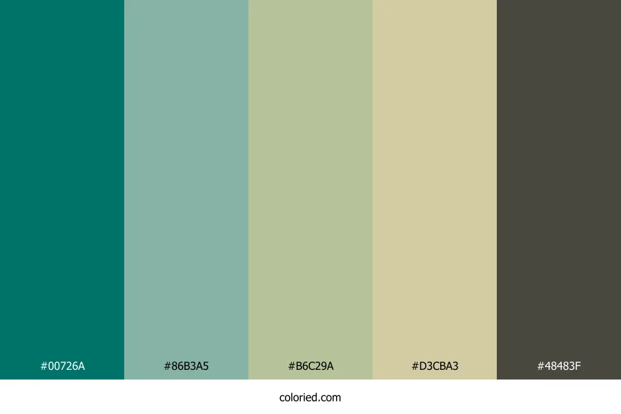 ![]() | #00726A | 0, 114, 106 | 176, 100%, 22% | 100%, 0%, 7%, 55% | oklch(0.497 0.087 186) |