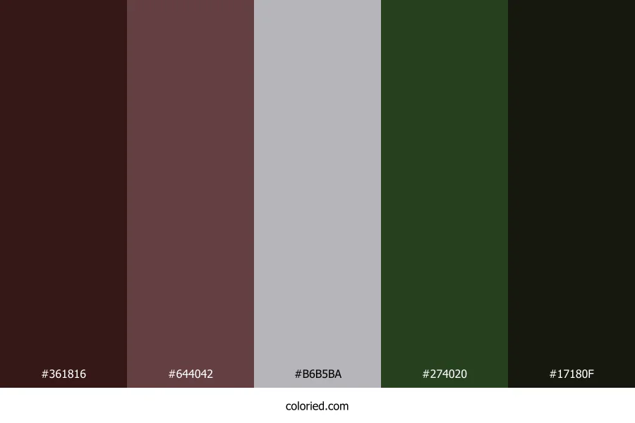 ![]() | #361816 | 54, 24, 22 | 4, 42%, 15% | 0%, 56%, 59%, 79% | oklch(0.252 0.048 25) |