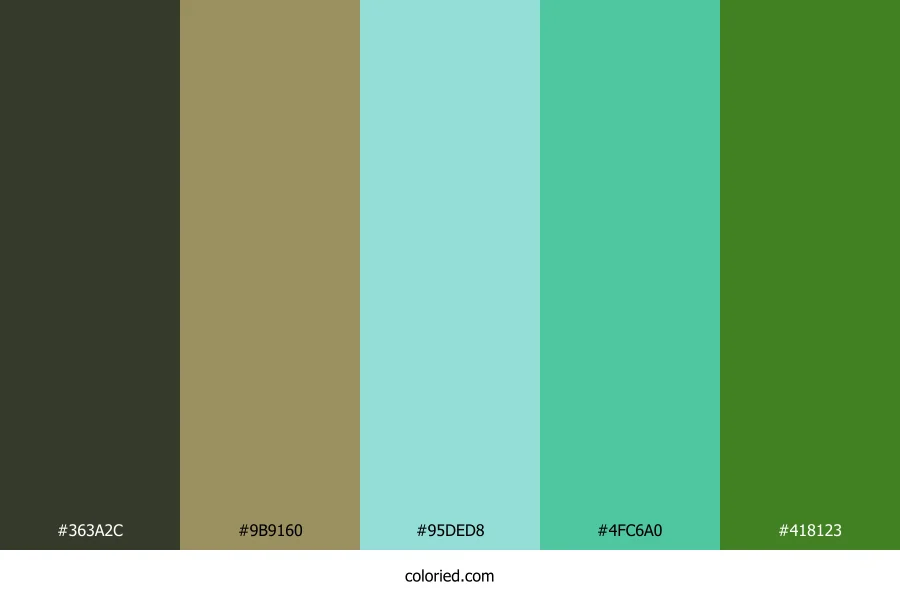 ![]() | #363A2C | 54, 58, 44 | 77, 14%, 20% | 7%, 0%, 24%, 77% | oklch(0.340 0.024 121) |