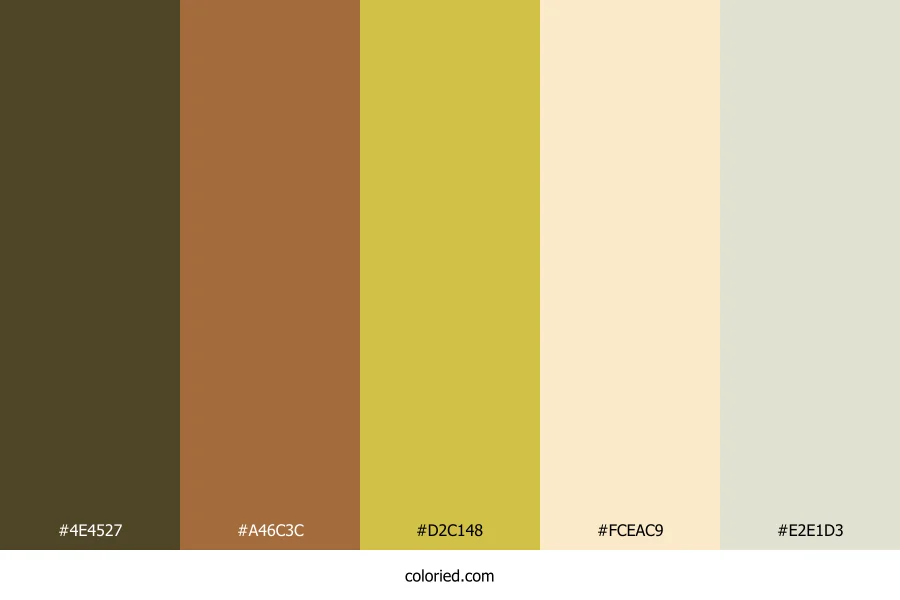 ![]() | #4E4527 | 78, 69, 39 | 46, 33%, 23% | 0%, 12%, 50%, 69% | oklch(0.392 0.047 93) |