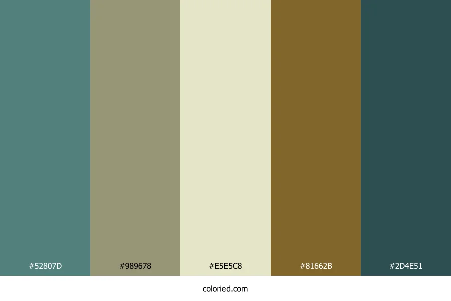 ![]() | #52807D | 82, 128, 125 | 176, 22%, 41% | 36%, 0%, 2%, 50% | oklch(0.566 0.051 191) |