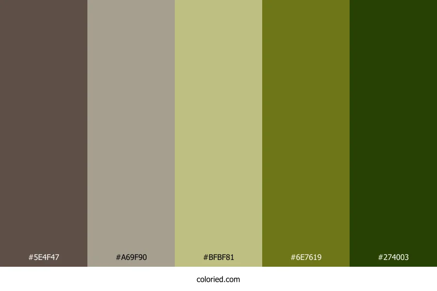 | #6E7619 | 110, 118, 25 | 65, 65%, 28% | 7%, 0%, 79%, 54% | oklch(0.542 0.112 115) | |