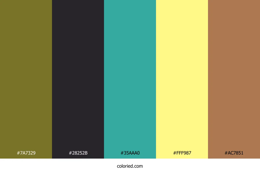 ![]() | #7A7329 | 122, 115, 41 | 55, 50%, 32% | 0%, 6%, 66%, 52% | oklch(0.547 0.095 104) |