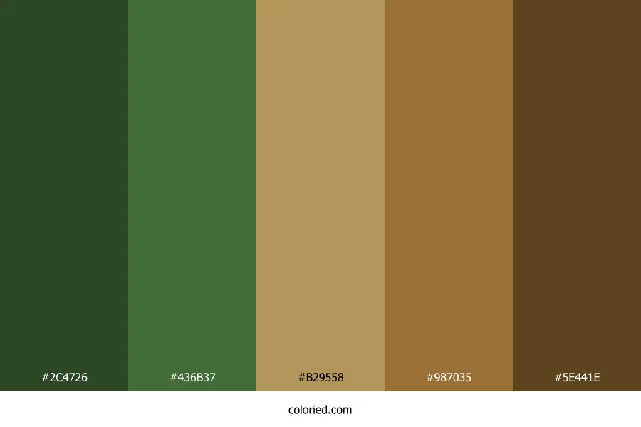 ![]() | #2C4726 | 44, 71, 38 | 109, 30%, 21% | 38%, 0%, 46%, 72% | oklch(0.367 0.064 140) |
