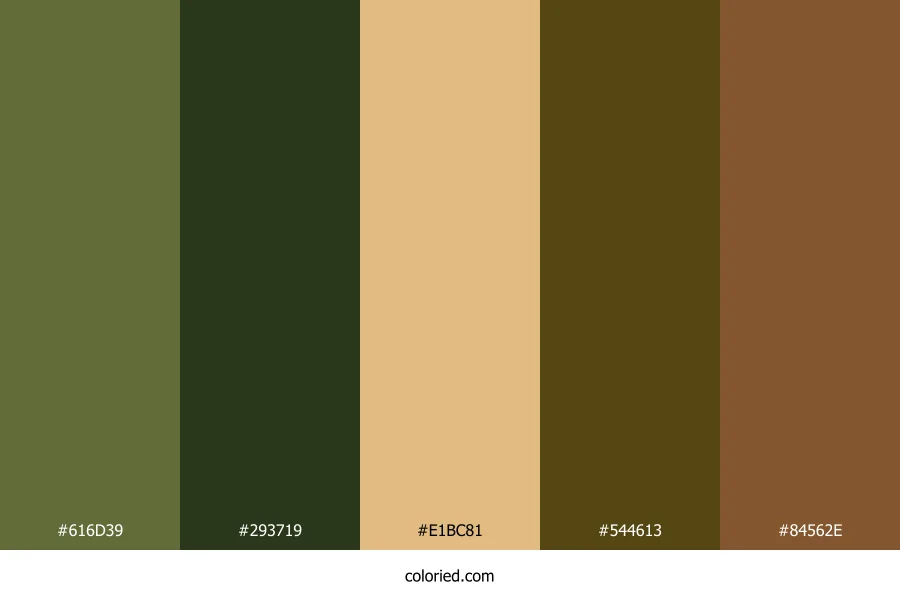![]() | #616D39 | 97, 109, 57 | 74, 31%, 33% | 11%, 0%, 48%, 57% | oklch(0.512 0.076 120) |