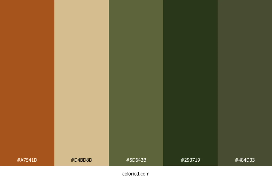 | #5D643B | 93, 100, 59 | 70, 26%, 31% | 7%, 0%, 41%, 61% | oklch(0.486 0.061 117) | |
