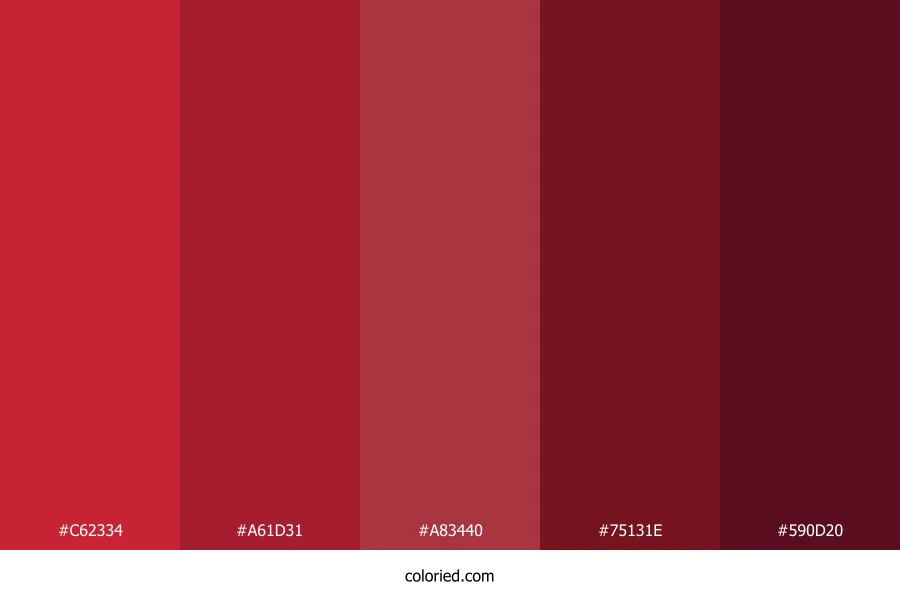 ![]() | #C62334 | 198, 35, 52 | 354, 70%, 46% | 0%, 82%, 74%, 22% | oklch(0.537 0.196 22) |