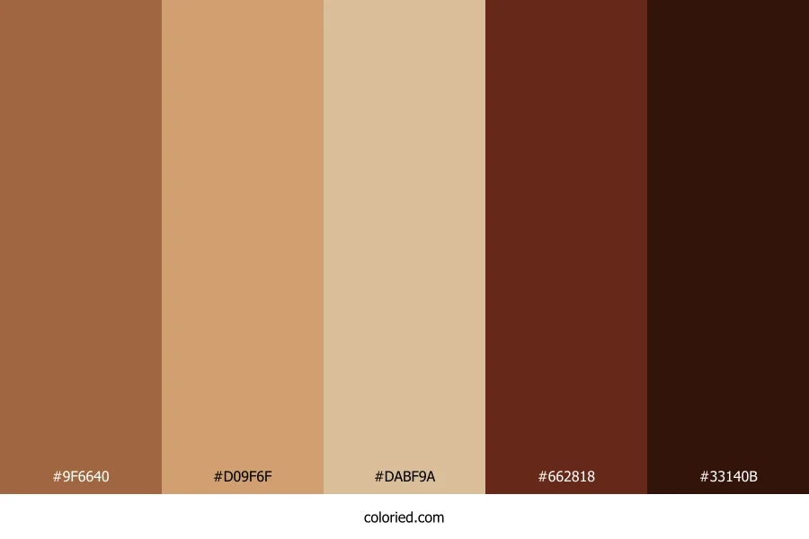 ![]() | #9F6640 | 159, 102, 64 | 24, 43%, 44% | 0%, 36%, 60%, 38% | oklch(0.564 0.091 54) |