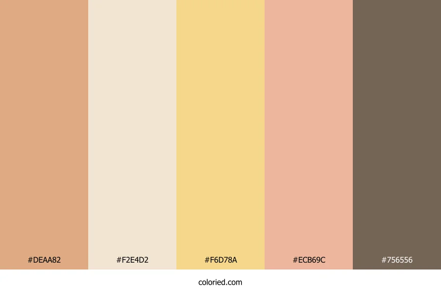 ![]() | #DEAA82 | 222, 170, 130 | 26, 58%, 69% | 0%, 23%, 41%, 13% | oklch(0.777 0.081 59) |