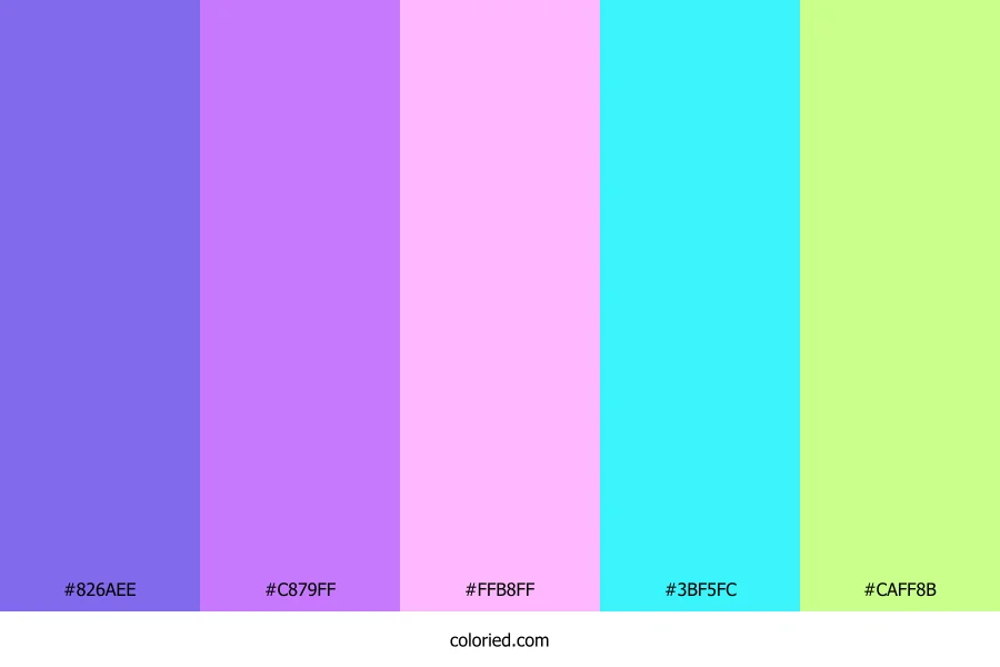 ![]() | #826AEE | 130, 106, 238 | 251, 80%, 67% | 45%, 55%, 0%, 7% | oklch(0.614 0.191 288) |