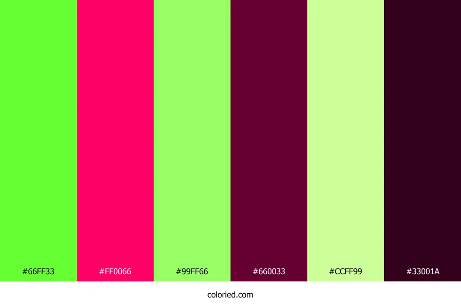 | #660033 | 102, 0, 51 | 330, 100%, 20% | 0%, 100%, 50%, 60% | oklch(0.331 0.134 360) | |