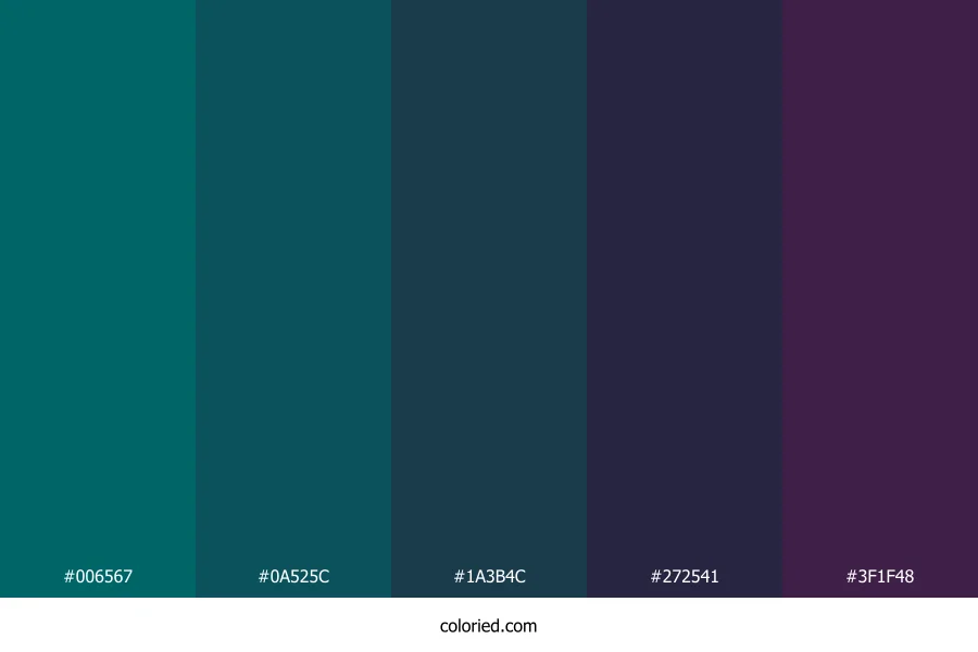 ![]() | #006567 | 0, 101, 103 | 181, 100%, 20% | 100%, 2%, 0%, 60% | oklch(0.460 0.078 197) |