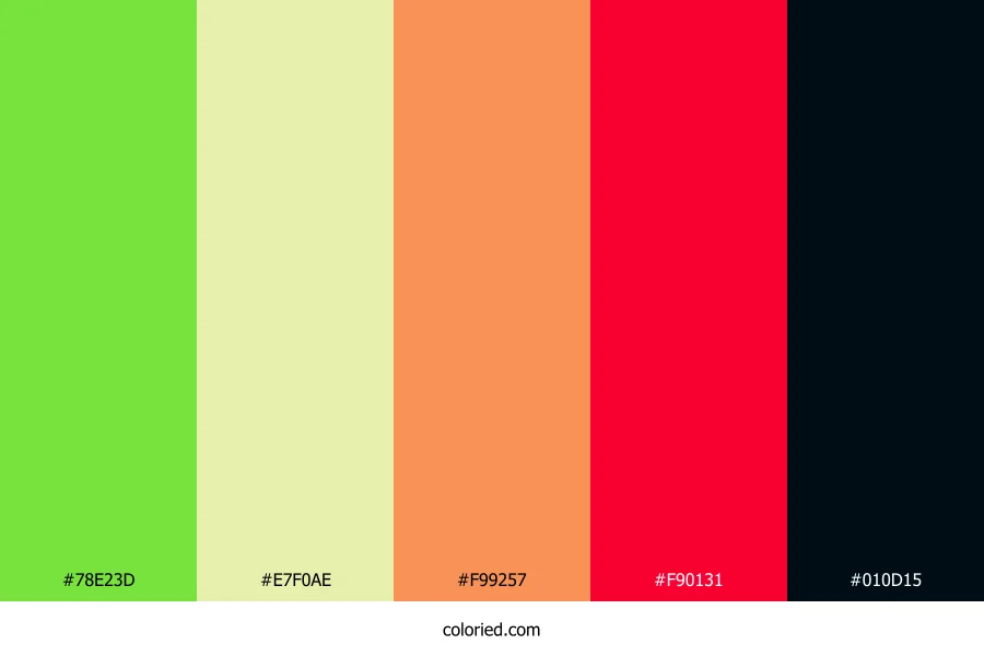 ![]() | #78E23D | 120, 226, 61 | 99, 74%, 56% | 47%, 0%, 73%, 11% | oklch(0.818 0.220 137) |