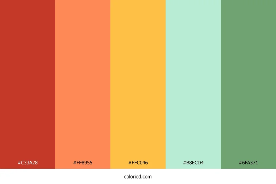 ![]() | #C33A28 | 195, 58, 40 | 7, 66%, 46% | 0%, 70%, 79%, 24% | oklch(0.549 0.177 31) |