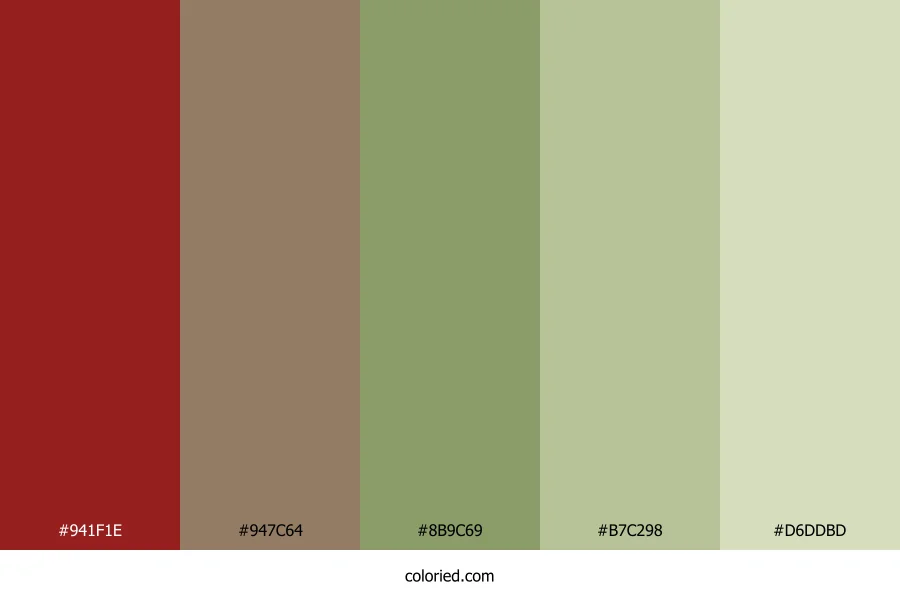 ![]() | #941F1E | 148, 31, 30 | 1, 66%, 35% | 0%, 79%, 80%, 42% | oklch(0.438 0.153 27) |