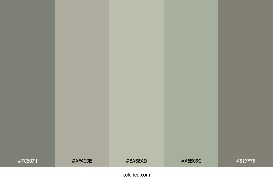 ![]() | #7C8074 | 124, 128, 116 | 80, 5%, 48% | 3%, 0%, 9%, 50% | oklch(0.593 0.018 122) |