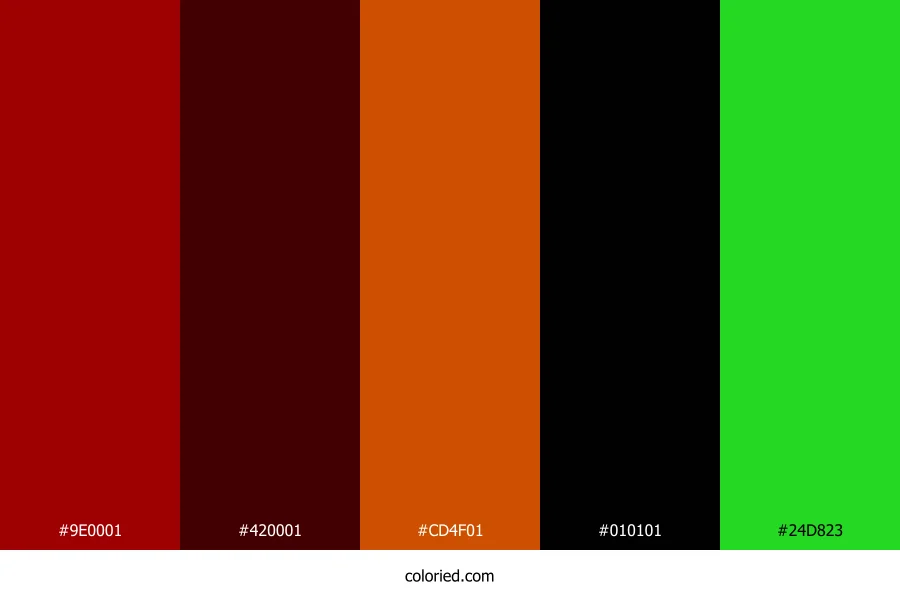 ![]() | #9E0001 | 158, 0, 1 | 360, 100%, 31% | 0%, 100%, 99%, 38% | oklch(0.439 0.180 29) |