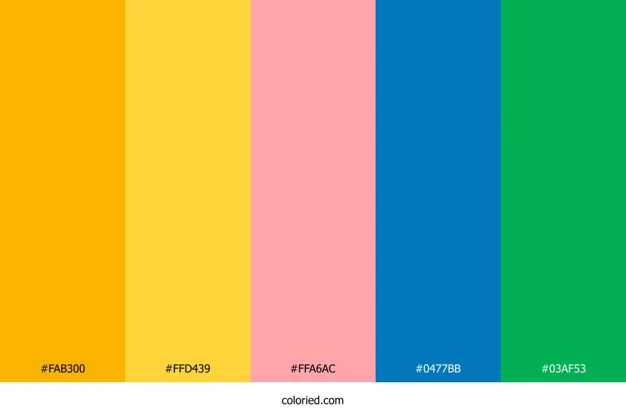 ![]() | #FAB300 | 250, 179, 0 | 43, 100%, 49% | 0%, 28%, 100%, 2% | oklch(0.812 0.168 80) |