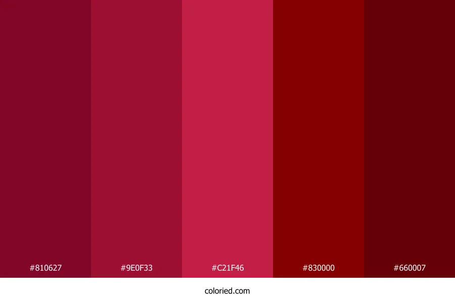 ![]() | #810627 | 129, 6, 39 | 344, 91%, 26% | 0%, 95%, 70%, 49% | oklch(0.386 0.150 16) |