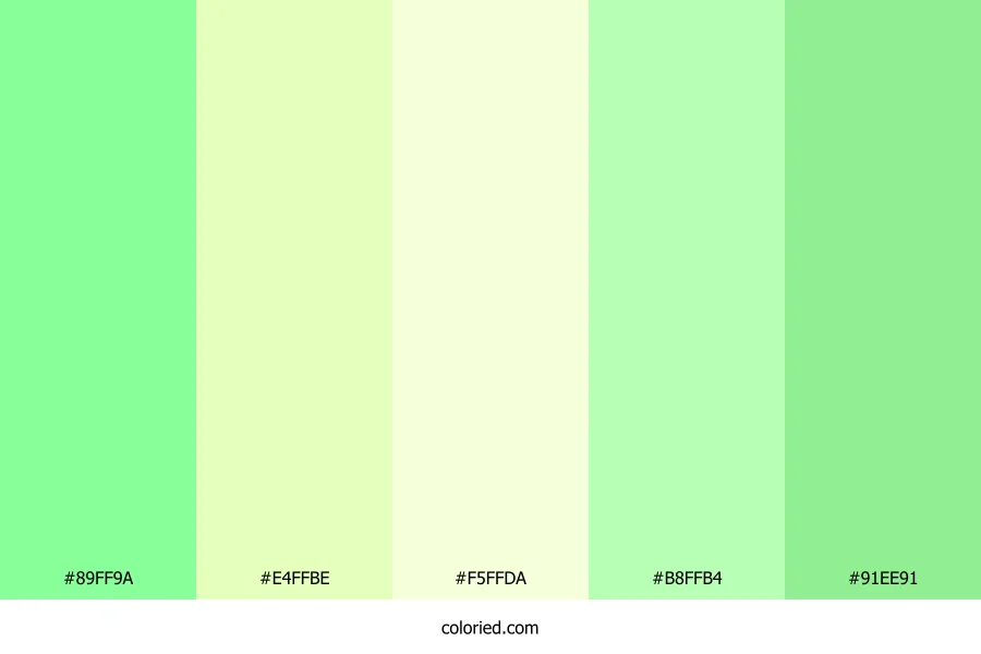 ![]() | #89FF9A | 137, 255, 154 | 129, 100%, 77% | 46%, 0%, 40%, 0% | oklch(0.907 0.174 147) |