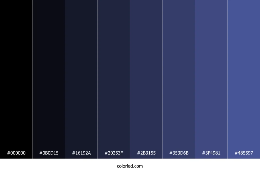 | #0B0D15 | 11, 13, 21 | 228, 31%, 6% | 48%, 38%, 0%, 92% | oklch(0.161 0.017 273) | |