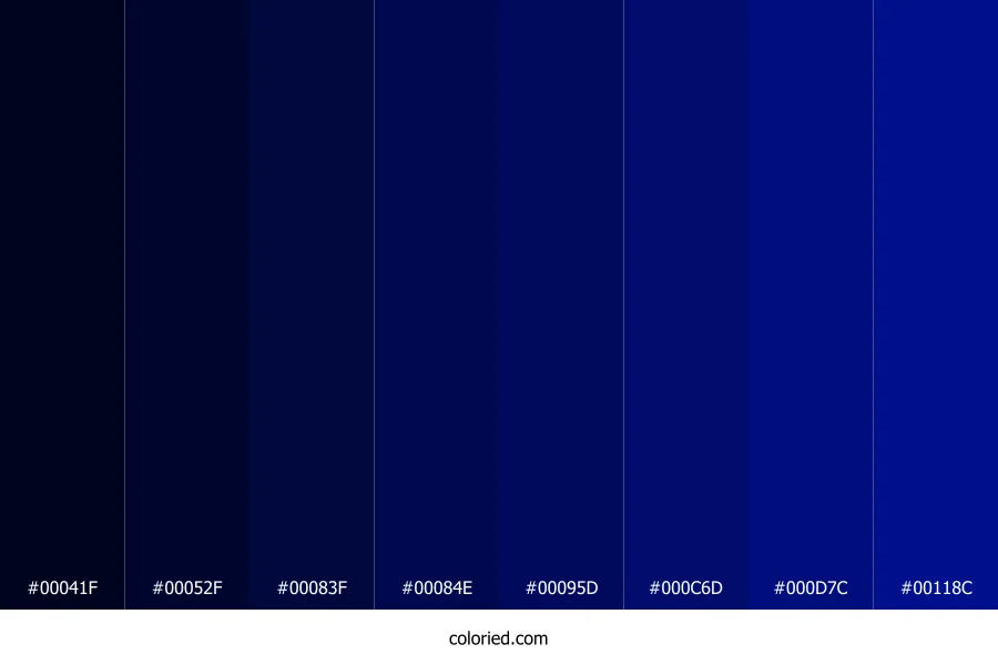| #000D7C | 0, 13, 124 | 234, 100%, 24% | 100%, 90%, 0%, 51% | oklch(0.277 0.176 264) | |