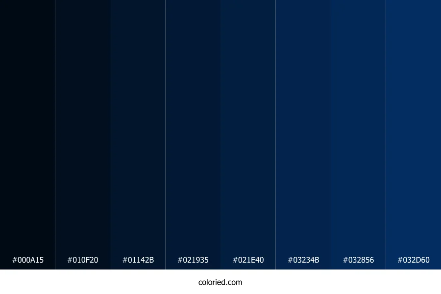 | #01142B | 1, 20, 43 | 213, 95%, 9% | 98%, 53%, 0%, 83% | oklch(0.190 0.054 252) | |