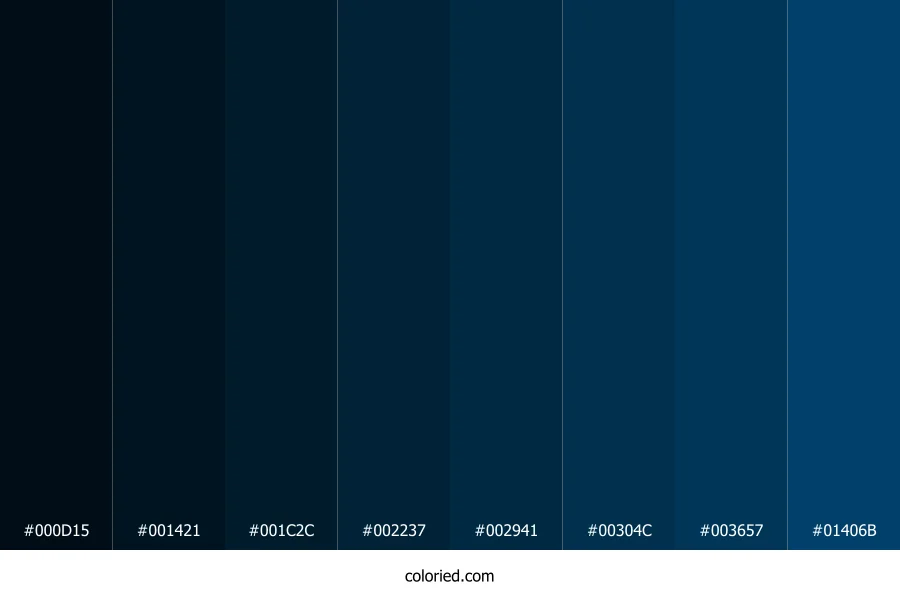 ![]() | #000D15 | 0, 13, 21 | 203, 100%, 4% | 100%, 38%, 0%, 92% | oklch(0.149 0.030 230) |