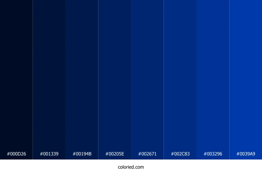 ![]() | #000D26 | 0, 13, 38 | 219, 100%, 7% | 100%, 66%, 0%, 85% | oklch(0.164 0.057 257) |