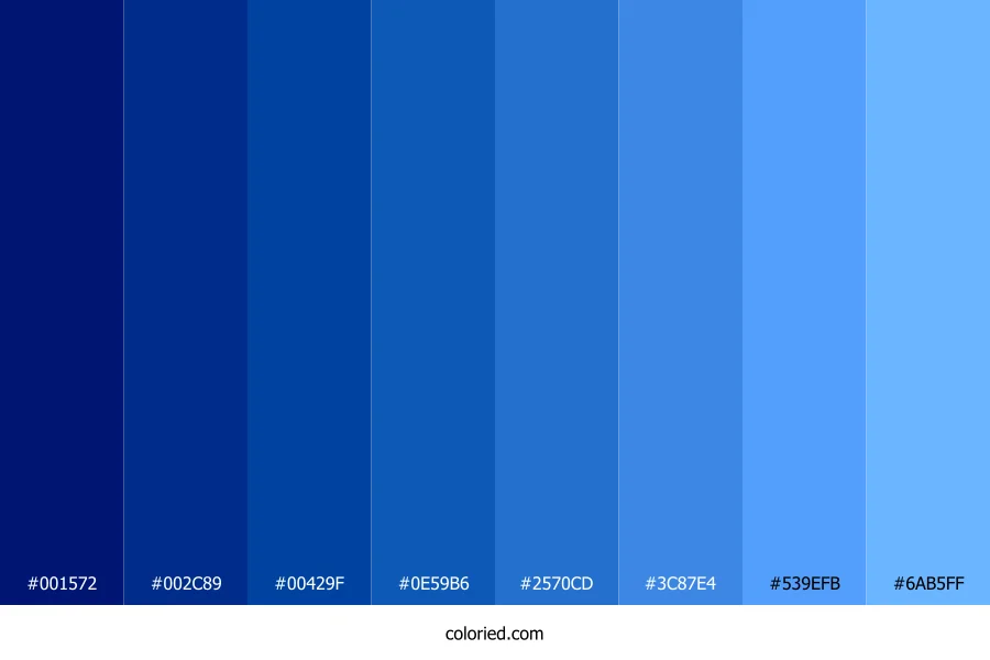 ![]() | #001572 | 0, 21, 114 | 229, 100%, 22% | 100%, 82%, 0%, 55% | oklch(0.273 0.157 264) |