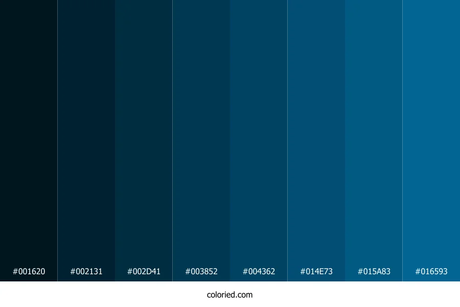 | #002131 | 0, 33, 49 | 200, 100%, 10% | 100%, 33%, 0%, 81% | oklch(0.233 0.049 234) | |